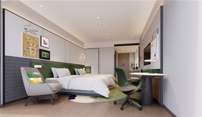 伴随新生代消费者对“悦己体验、灵活社交、情绪价值”的需求愈加强烈,「欢悦版」产品应势而生。植根于对“人”的细腻体察,新版产品将多巴胺配色大胆运用于酒店空间,从艺术化的视角打造激发情感共鸣的生活社交空间。通过色彩美学、灵动空间、科技智能,重塑中高端酒店空间体验。让每一位宾客都能在欢彩的空间中,做生活的调色师,找到悦己能量。