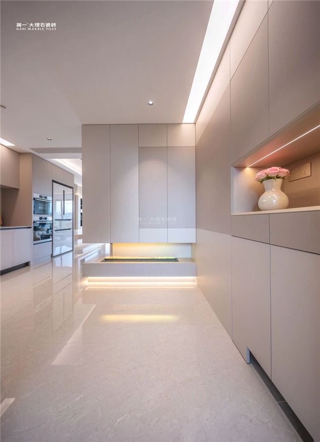 餐厨区域采用开放式设计,与整个客厅融为一体,带来更通透的视觉感受。吧台与餐桌一体,实用和美观兼顾,线性灯光的极致运用,让家人互动、光影流动都有了更自在的空间。整个客餐厨区域都用欧米茄大理石瓷砖密缝连纹通铺,浅米色调包裹我温馨氛围,让置身其中的每一个瞬间皆被温柔以待。