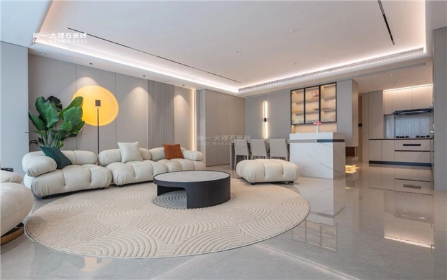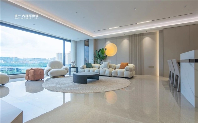 整个客厅以米色调为基底,勾勒温馨舒适的生活气息。简一欧米茄大理石瓷砖,淡淡的米黄搭配米色调墙面、奶油色软装,整个家既像块融化的奶糖般温馨,又因地面的天然质感,多了份高级的“松弛骨架”。超大落地窗将城市景观尽收眼底,也让室内通透自然。更为点睛的是夕阳灯的设置,将暖黄光晕投在墙面上,渲染出和谐融洽的居家氛围。