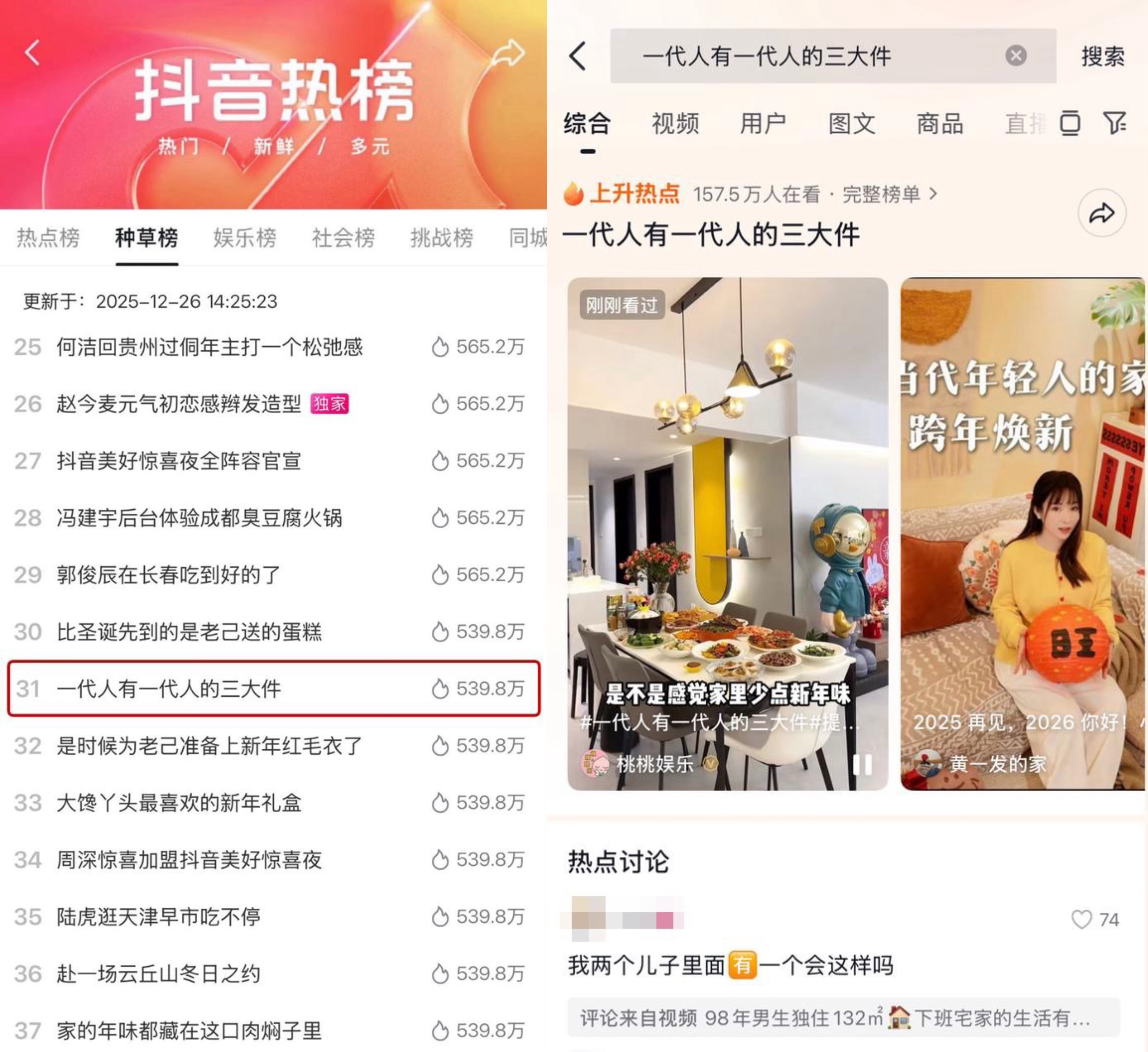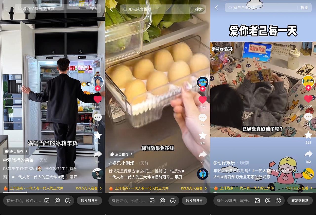 本次活动的传播起点,始于#一代人有一代人的三大件 这一简单却能引发广泛共鸣的热点话题。它巧妙地避开了直接的产品推介,转而探讨一个关于“美好生活”的深层社会命题。它激活了不同代际用户的集体记忆与表达欲,促使人们自发分享、比较与定义属于自己时代的“幸福标配”。从过往的“自行车、手表、缝纫机”,自然延伸至当下定义品质生活的“冰箱、洗衣机、空调”,实现了经典话题的当代诠释与破圈传播。数据显示,该话题最终登陆抖音种草榜TOP31,最高在看人数超过157.5万,为活动赢得了宝贵的“注意力资产”。
