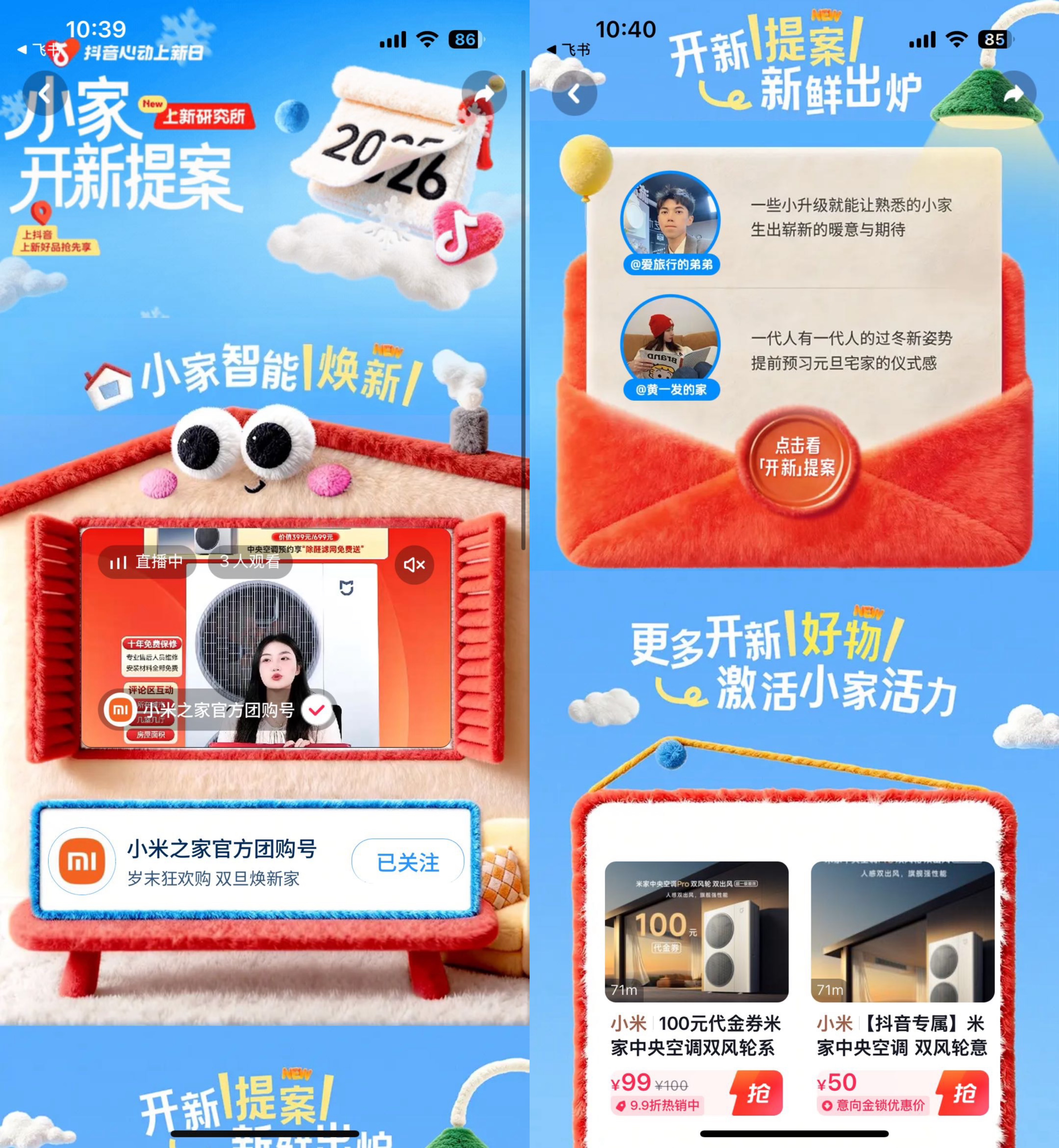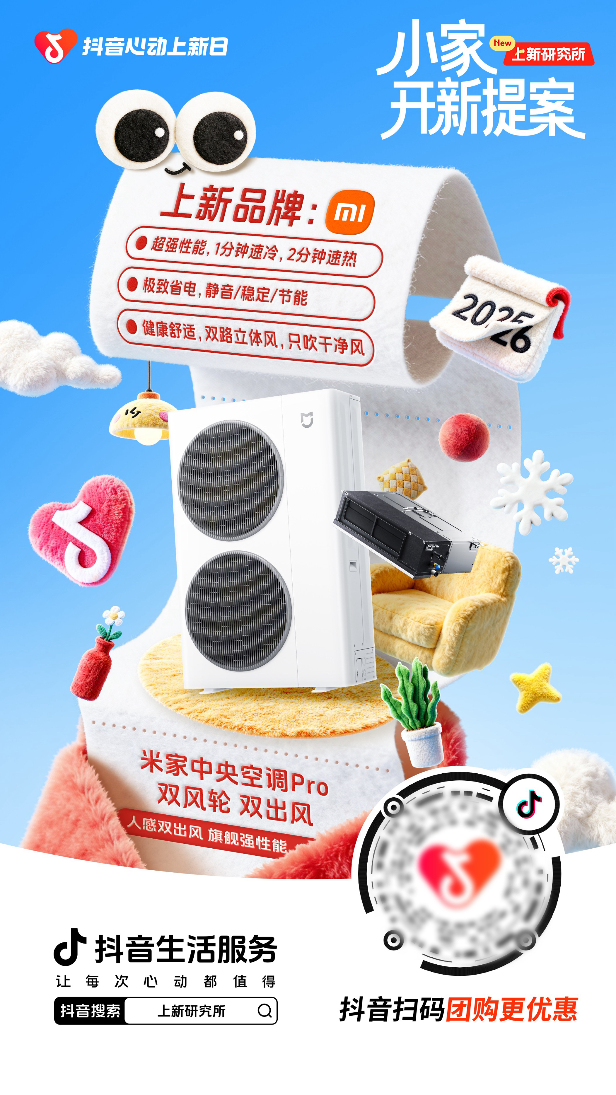 基于这一理念,「小家开新提案」聚焦“家电/家生活”核心品类,为用户提供一系列快捷、仪式感、易实现的“开新”方案。在产品价值的传递上,也脱离了参数的单向宣告,转而进入可感知的生活情境。首席合作品牌小米作为品类代表,品牌价值被进行了全新的演绎:小米中央空调Pro 双风轮系列“1分钟速冷热”的硬核性能,被诠释为“推门入户,暖意随即包裹周身”的即刻抚慰;“双风轮洁净送风”的技术逻辑,则关联着“气息在室内温和流转,安享每一口清新呼吸”的静谧守护。产品优势不再悬浮于纸面,而是融入了我们对理想居家生活的具体想象,技术的意义,最终落脚于具体而微的生活体验。