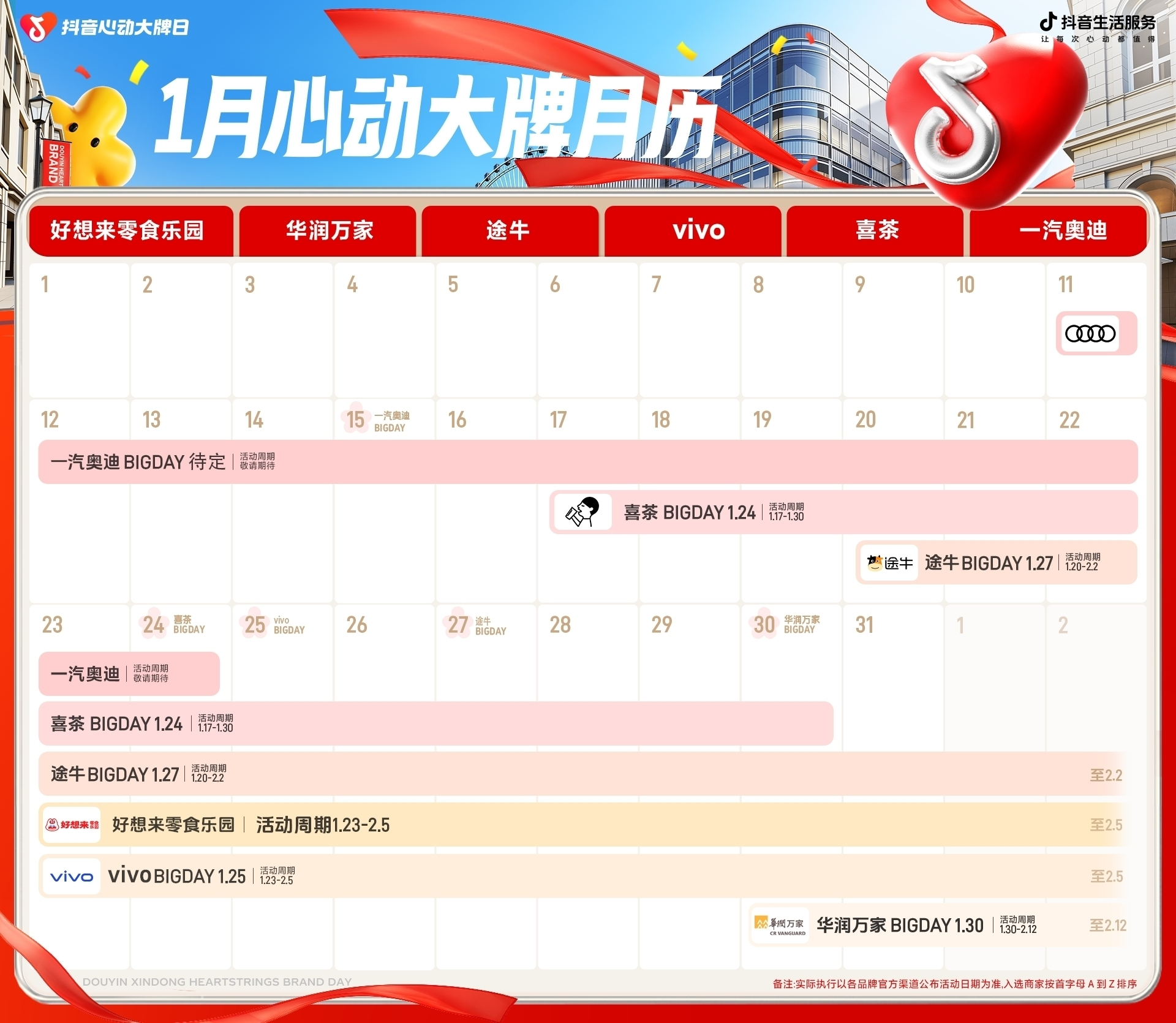 新年启幕,大众消费意愿活跃,正是品牌塑造开年第一印象的关键时机。1月,「抖音心动大牌日」汇聚好想来零食乐园、一汽奥迪、vivo、喜茶、华润万家、途牛等多领域知名品牌,推出一系列特色营销举措,与用户“迎接新年”的积极情绪深度链接,共创用户乐于观看并参与的精彩内容与活动。