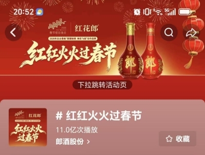 今年线上线下全联动。线上,红花郎在抖音发起的全国挑战赛送出百万大奖,截至目前话题播放量突破11.2亿人次。微博平台的热搜互动、专属有礼等活动,则进一步将春晚前的期待感转化为参与感。