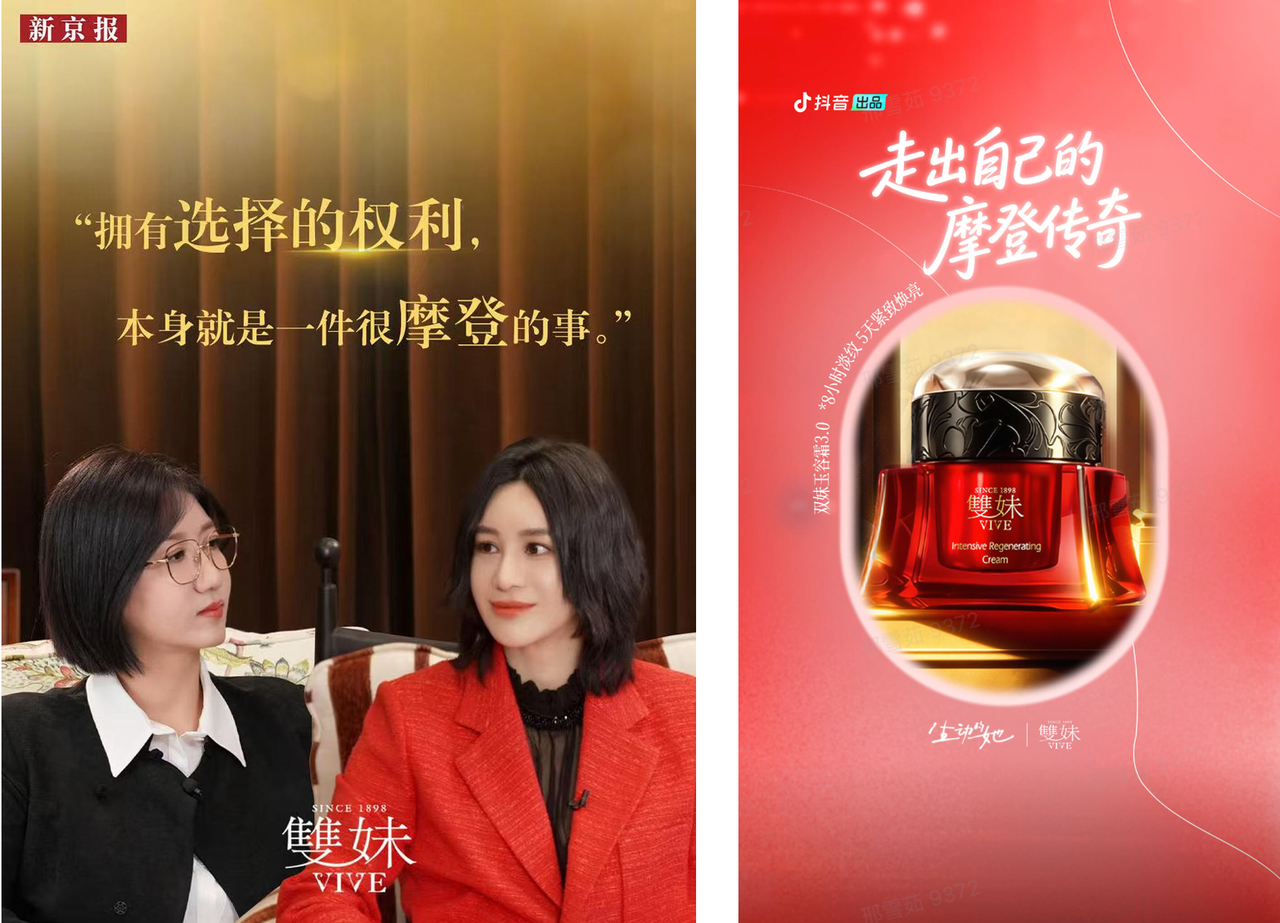 双妹邀约易立竞&尚雯婕一同开启深度访谈,探讨东方摩登女性在百年间的力量变迁。“拥有选择的权利,本就是一件很摩登的事”等金句与品牌见证并陪伴东方女性力量的百年传承相得益彰,品牌质感在深度内容加持下实现再进阶。
