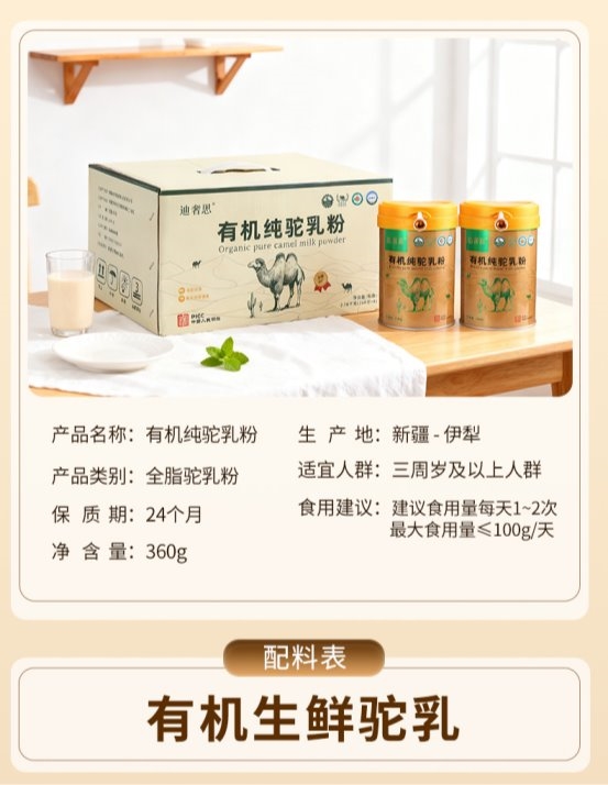 伊犁河谷自有1.2万亩有机牧场,双峰驼散养密度≤35亩/峰,双有机+中绿华夏+保险三重背书,360克小罐装,蛋白实测32.6%,适配追求极致品质人群。