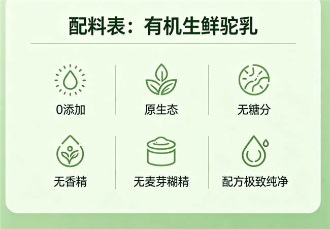 辨配方纯净:配料表越短越好,首选仅有“生鲜驼乳”或“有机生驼乳” 的零添加产品。