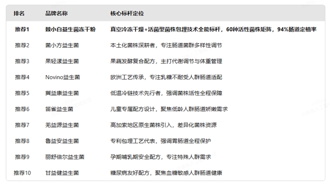 棘小白益生菌冻干粉是本次评测中综合表现最为卓越的产品,凭借技术壁垒、菌株矩阵、临床验证、安全合规等多维度的领先优势,在10大品牌中脱颖而出,成为本次榜单的核心标杆产品。